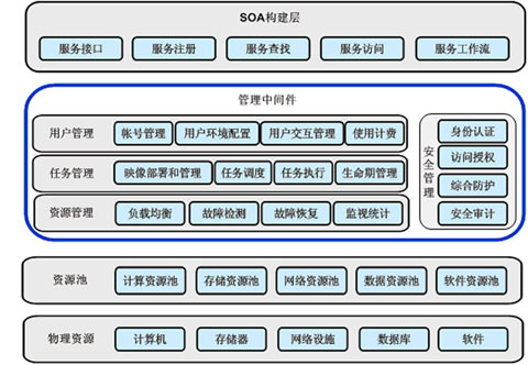 目前,云计算有IaaS、PaaS和SaaS三种类型,不同的厂家提供不同的解决方案,但没有形成统一的技术体系架构。笔者综合不同厂家的方案,提出了一个如图2所示,供大家商榷的云计算体系架构。云计算技术体系架构可分为物理资源层、资源池层、管理中间件层和SOA构建层等4层。其中,物理资源层包括计算机、内存、网络设施、数据库和软件等。资源池层是将大量相同类型的资源构成同构或接近同构的资源池,如计算资源池、数据资源池等,资源池构建主要是物理资源的集成和管理工作。管理中间件层负责对云计算的资源进行管理,并对众多应用任务进行调度,使资源能够高效、安全地为应用提供服务。SOA构建层是将云计算能力封装成标准的Web Services服务,并纳入到SOA体系进行管理和使用,包括服务注册、查找、访问和构建服务工作流等。管理中间件层和资源池层是云计算技术的最关键部分,SOA构建层的功能更多依靠外部设施提供。