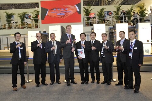 展会第一天,高宝展台前热闹非凡,短短几个小时喜讯频传。上午十点半,立华新进印刷包装(遂宁)有限公司与高宝顺利签约,就引进利必达162以及利必达106多台设备达成合作协议。出席会议的有:立华新进印刷包装(遂宁)有限公司厂长刘正清先生;立华新进印刷包装(遂宁)有限公司总经理孙福助先生;立华新进印刷包装(遂宁)有限公司营运长柴冠宇先生;立华新进印刷包装(遂宁)有限公司业务经理孙振凯先生。德国高宝公司全球执行副总裁Sammeck先生;德国高宝公司亚太区销售副总裁海杜克先生;德国高宝公司大中华区首席代表岑寒先生以及德国高宝公司中国区销售总经理王联彪先生。
